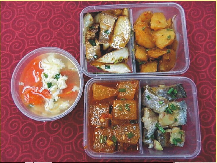 红烧海鲜、茭白烧肉、洋葱土豆、红烧冬瓜、番茄蛋花汤、
