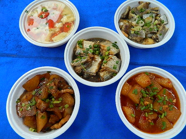 爆腌海鲜、红烧带鱼、萝卜烧肉、红烧冬瓜、番茄蛋花汤