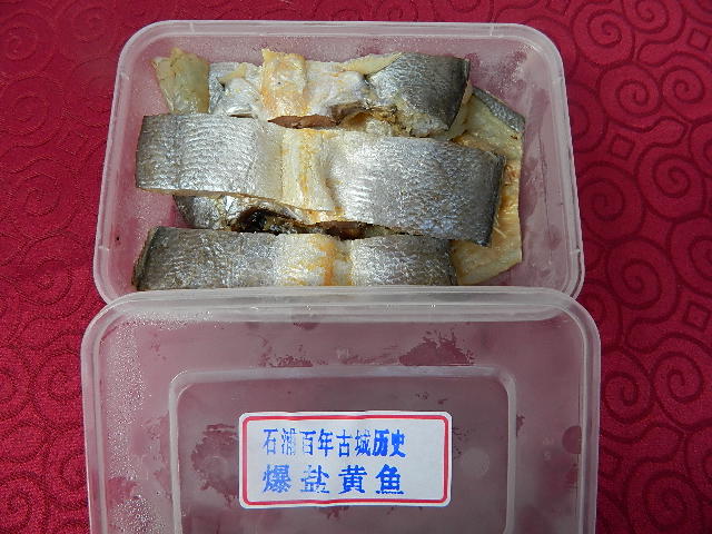 爆腌黄鱼、是石浦百年名菜,选用新鲜上等鲜鱼,清洗后沥干,加香酒、葱姜汁、精盐等调料爆腌数小时,然后在太阳下晒至半干。一斤鲜鱼只能制成半斤成品。蒸熟后食用,又香又鲜,回味无穷,是过去招待贵客的上等名菜。